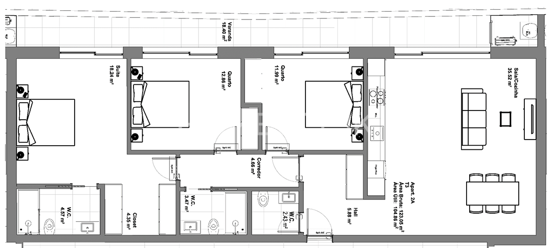 - Varanda: 18,40 m² (acesso por todas as divisões).